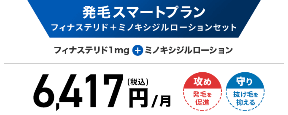 発毛スマートプラン (フィナステリド・ミノキシジルローションセット) | フィナステリド・ミノキシジル(内服薬)だけでなく、頭皮の露出が目立つ箇所にミノキシジルでアプローチをかけたい人。デュタステリドよりも副作用が少ない方が良い人。 |